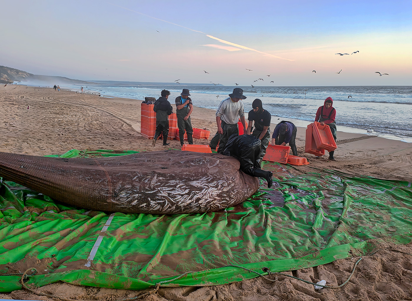 Los jóvenes pescadores, con la piel aún fresca de la brisa marina, depositaron la red sobre la arena. Los peces centelleaban como espejos inquietos, palpando la orilla con sus últimos saltos. El rumor del mar acompañaba la escena, y en los rostros de los muchachos brillaba la certeza humilde de una buena captura.