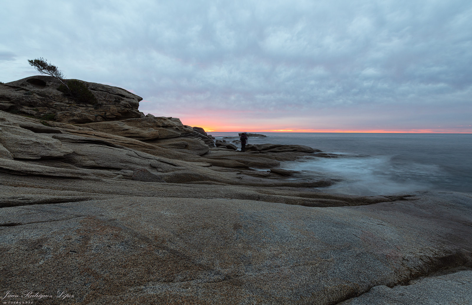 Un paisaje muy bonito, sobre todo por ese horizonte rompiendo en color contrastando con el tono frío general de la escena… en este caso no creo que aporte la figura del centro, parece que emborrona un poco al aparecer oscura y movida por la larga exposición, pero en general, gran calidad en el conjunto… los detalles del cielo son exquisitos…