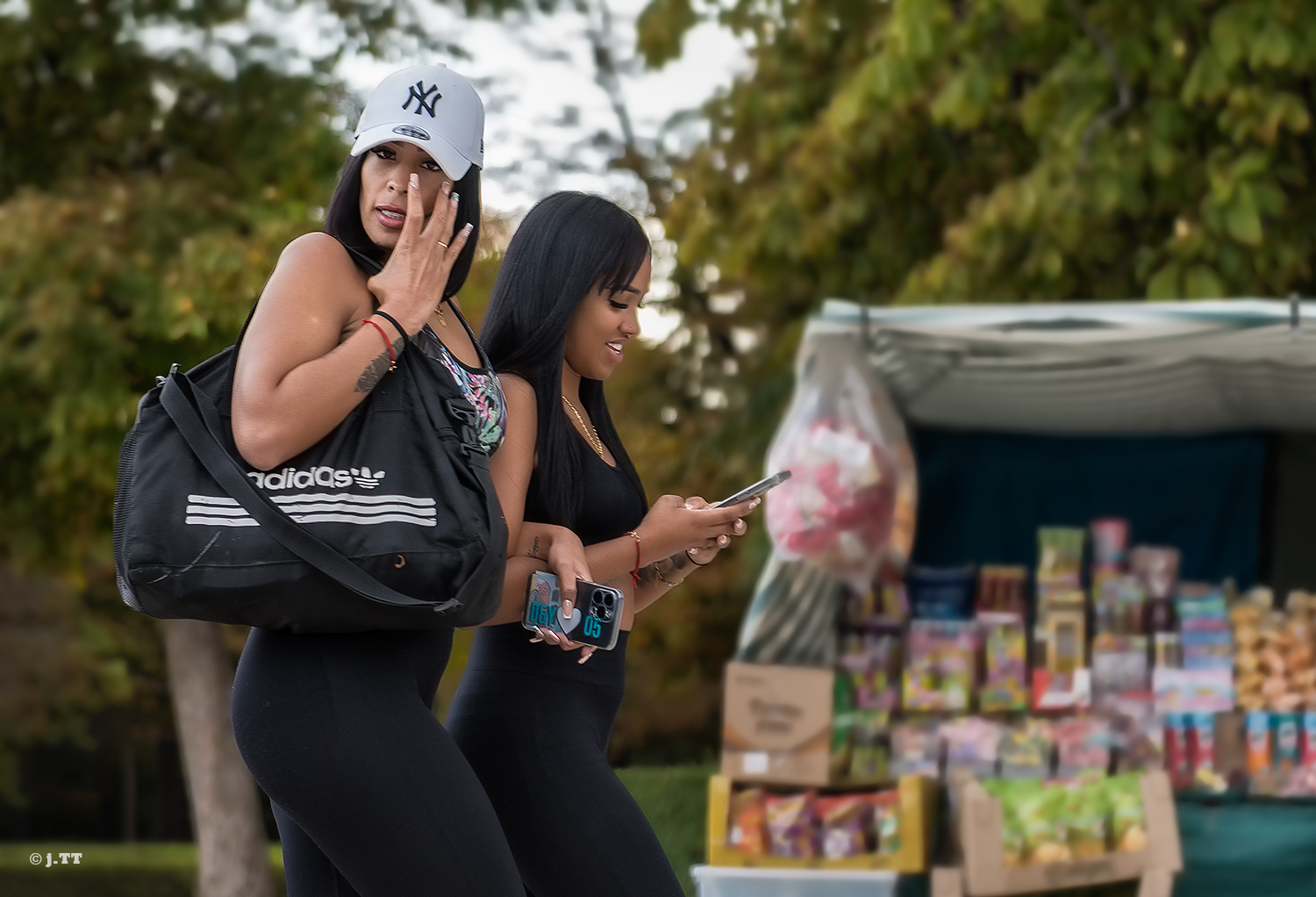Estupenda imagen, la expresión de la paisana peleando su pensión, el desenfoque, y la felicidad de la otra paisana con el móvil. No tiene desperdicio.
