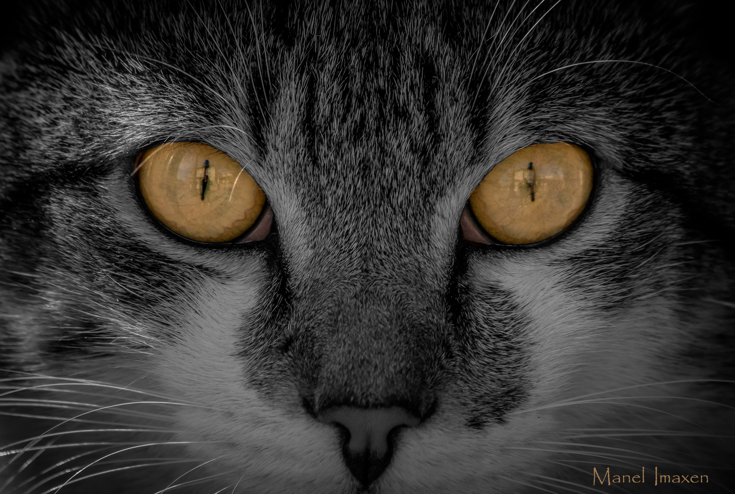 No me parece mala la idea, de ninguna manera, pero sí que la trabajaría algo más, esos ojos merecen un tratamiento algo más contundente en cuanto a brillo y volumen… seguro que el autorretrato quedaría más patente… también igualaría el brillo de los bigotes, o más brillo en los de la derecha, o menos en los de la izquierda, según miramos, claro…