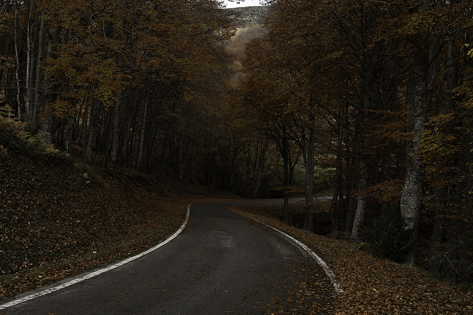 Me encanta el serpenteo que hace la carretera, bonita composición, y como se pierde en la curva final. Unos colores otoñales preciosos.