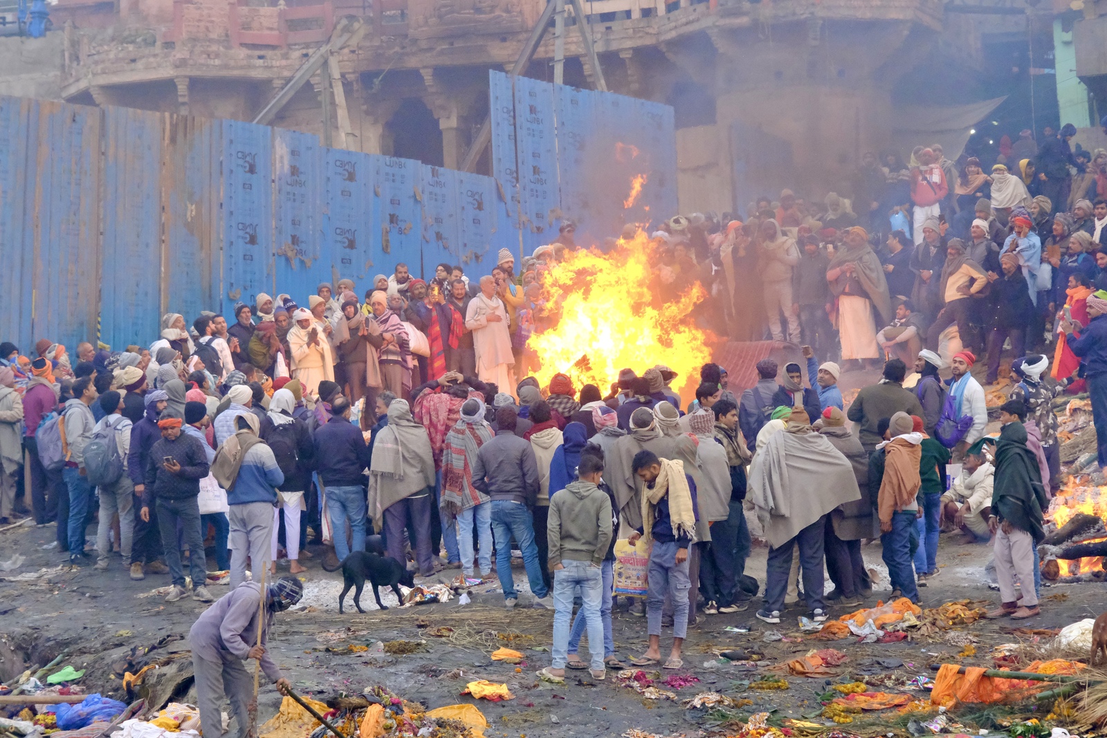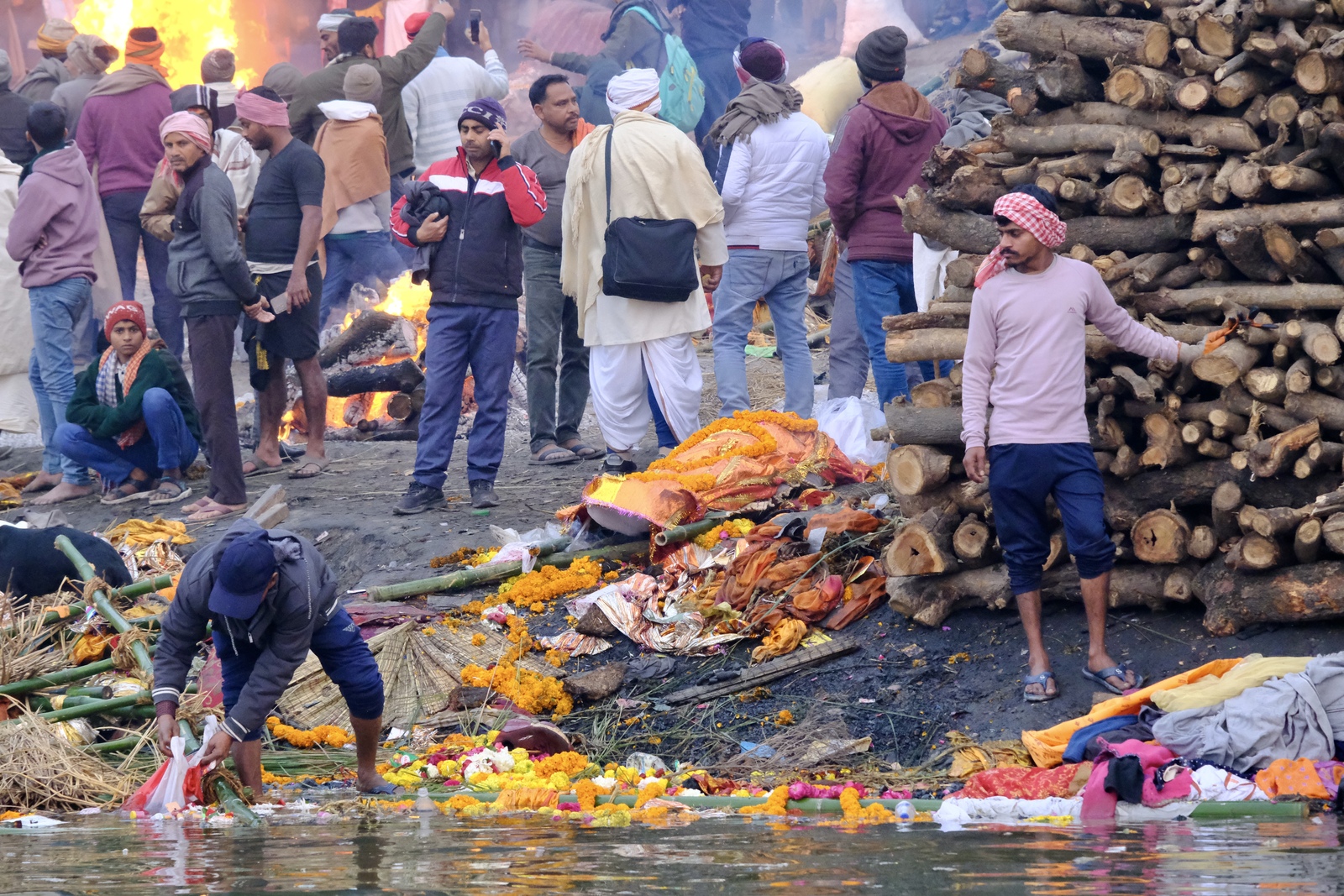 Una vez el cuerpo está preparado esperan a que un ghat de incineración se quede libre. Llegado el momento, los familiares preparan la pira funeraria y la cargan de leña para proceder a la incineración. Mientras tanto, el maestro de ceremonias se atavía con una túnica de color blanca.