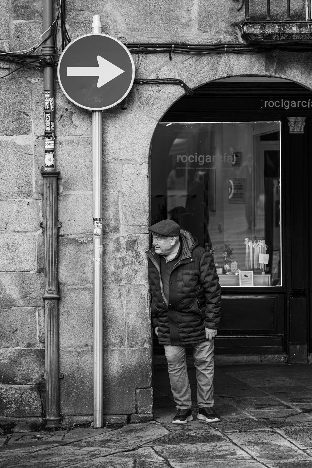 Curiosa la forma de apoyarse en la pared, normalmente se cruzan los brazos o se meten las manos en el bolsillo. Bien vista la escena, y bien editada, el texto acompaña estupendamente