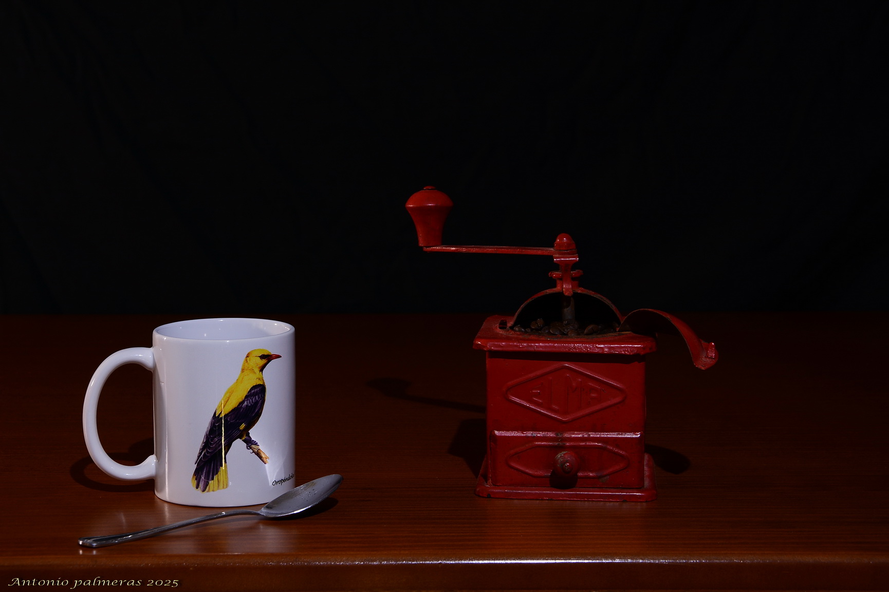 Además creo que sería más estético fotografiar por separado la taza y el molinillo (sin la cuchara). Puedes tratar la taza con luz suave, evitando los brillos y ese exceso de luz del flash. O también darle más protagonismo con un tele y un trípode (hay fotógrafos clásicos que han hecho arte con objetos cotidianos) y jugar con la posición de la taza y/o un ángulo más bajo, por ejemplo (a la altura de los ojos)…