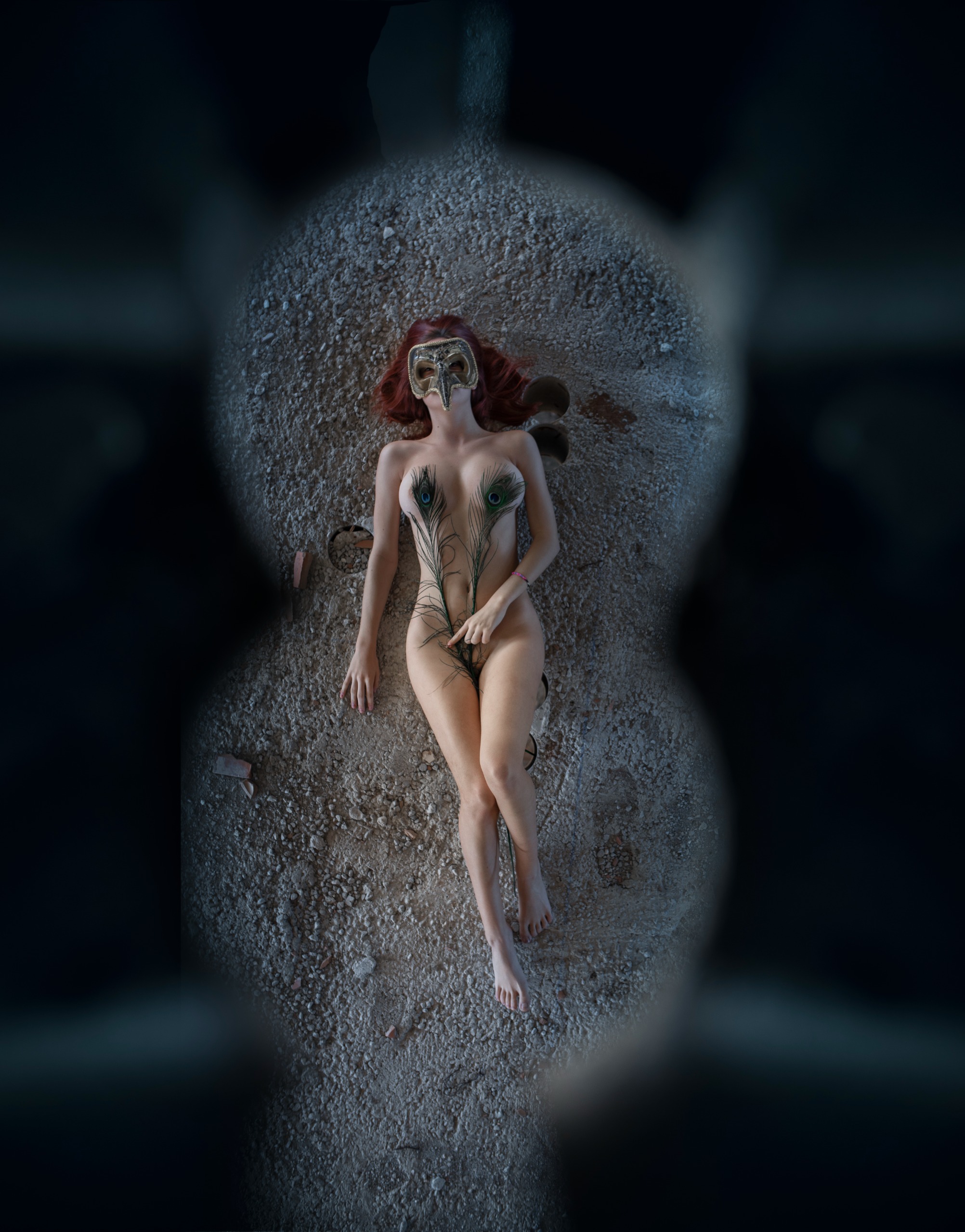 A través de los huecos en el suelo o en el techo según desde donde se mire, por donde irían los tubos de agua en un edificio abandonado