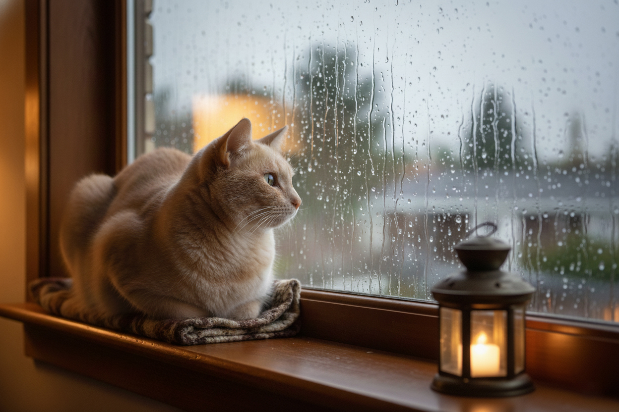 El gato es autentico. Se llama coco y estos dias esta harto de lluvia porque casi no puede salir. El escenario es IA