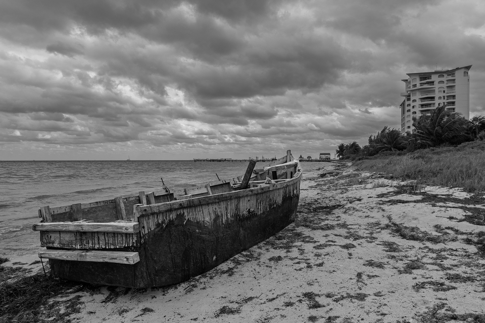 A mi me gusta el contraste entre la patera/barcaza y el edificio, son dos mundos distintos donde el primero anhela el segundo