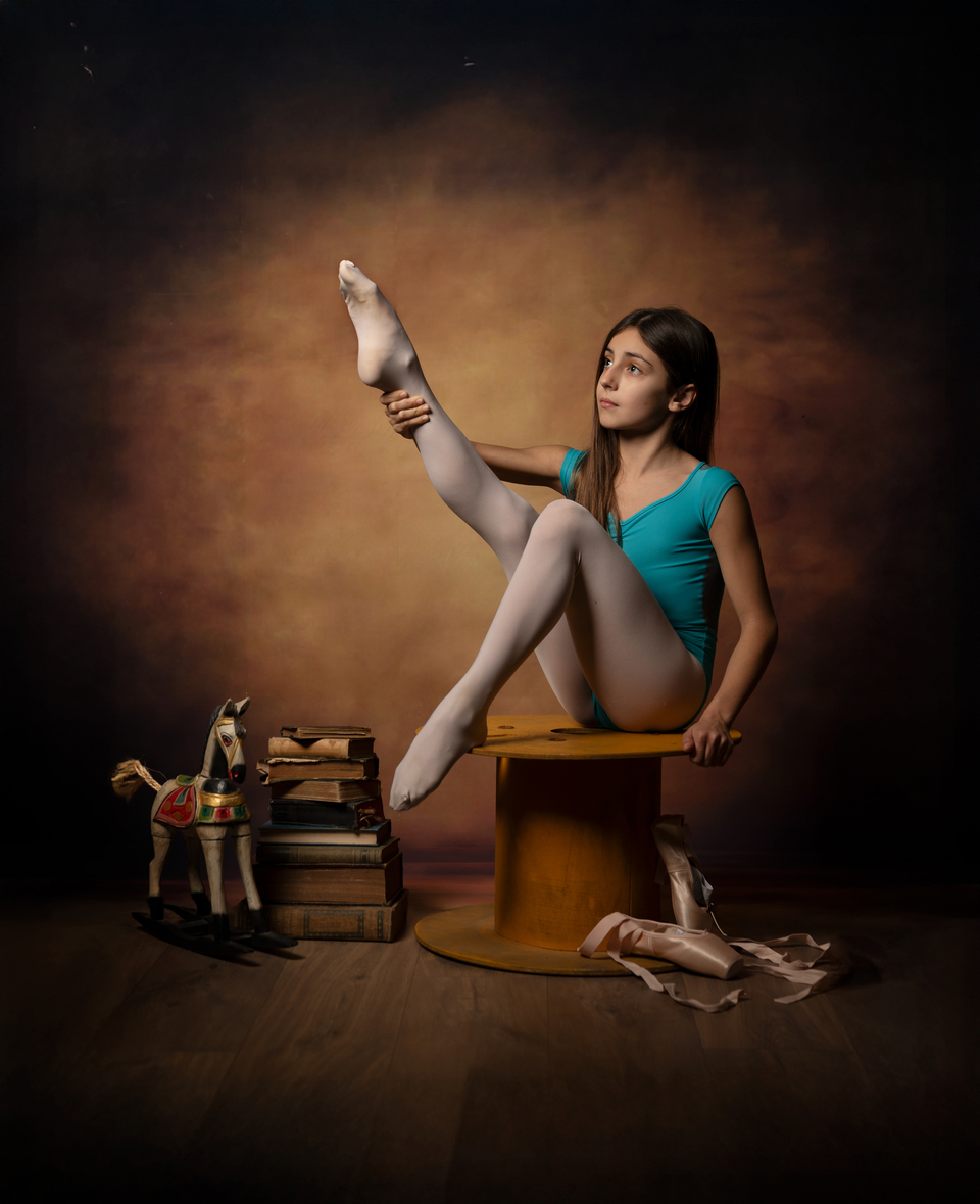 Paco, bajo mi punto de vista, el principal punto débil de la imagen está en la coherencia entre los elementos. El caballito y los libros remiten claramente a un imaginario antiguo, casi de otra época, mientras que el vestuario de la modelo es un diseño actual, contemporáneo…también tengo la sensación de que hay demasiados elementos con peso visual y simbólico. Tanto el caballito como los libros tienen mucha presencia (sobre todo el caballito en la segunda -aunque en la tercera esté algo más integrado en cuanto a luz y tonos) y acaban compitiendo entre sí y con la propia figura, cuando quizá la fuerza del retrato estaría en simplificar y dejar respirar más a la modelo, que es donde debería estar el foco emocional.