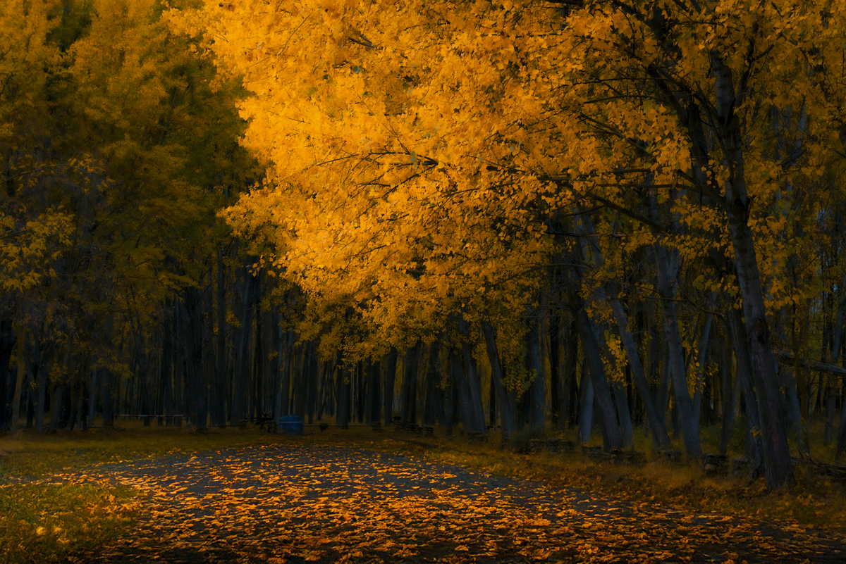 Bonita muestra del otoño, aunque creo que la edición no ha respetado la luz natural. La excesiva luminosidad de las hojas del árbol, no encaja con la oscuridad de todo lo que le rodea.