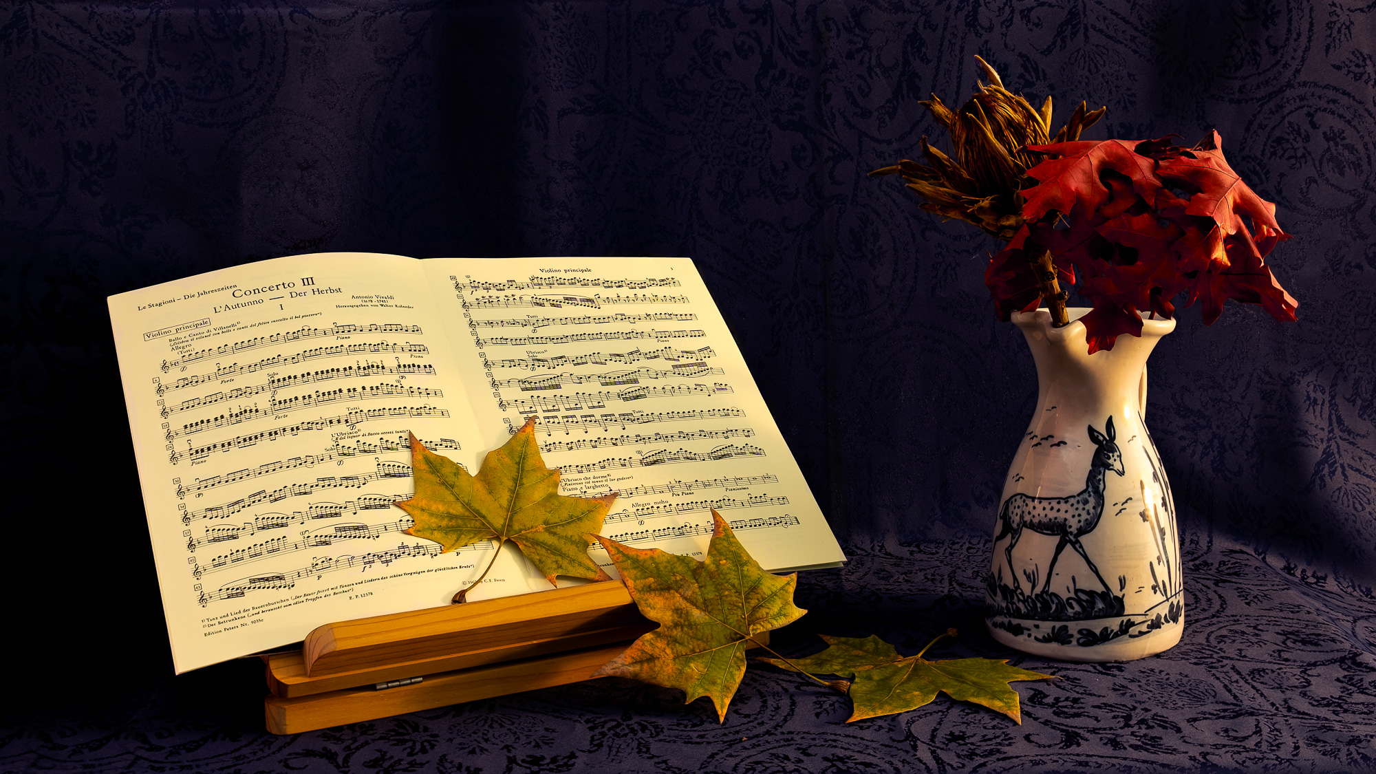 Me gusta el conjunto de cosas y su distribución en el encuadre quizá muy ordenadas las hojas verdes el libro de partituras muy fotogénico