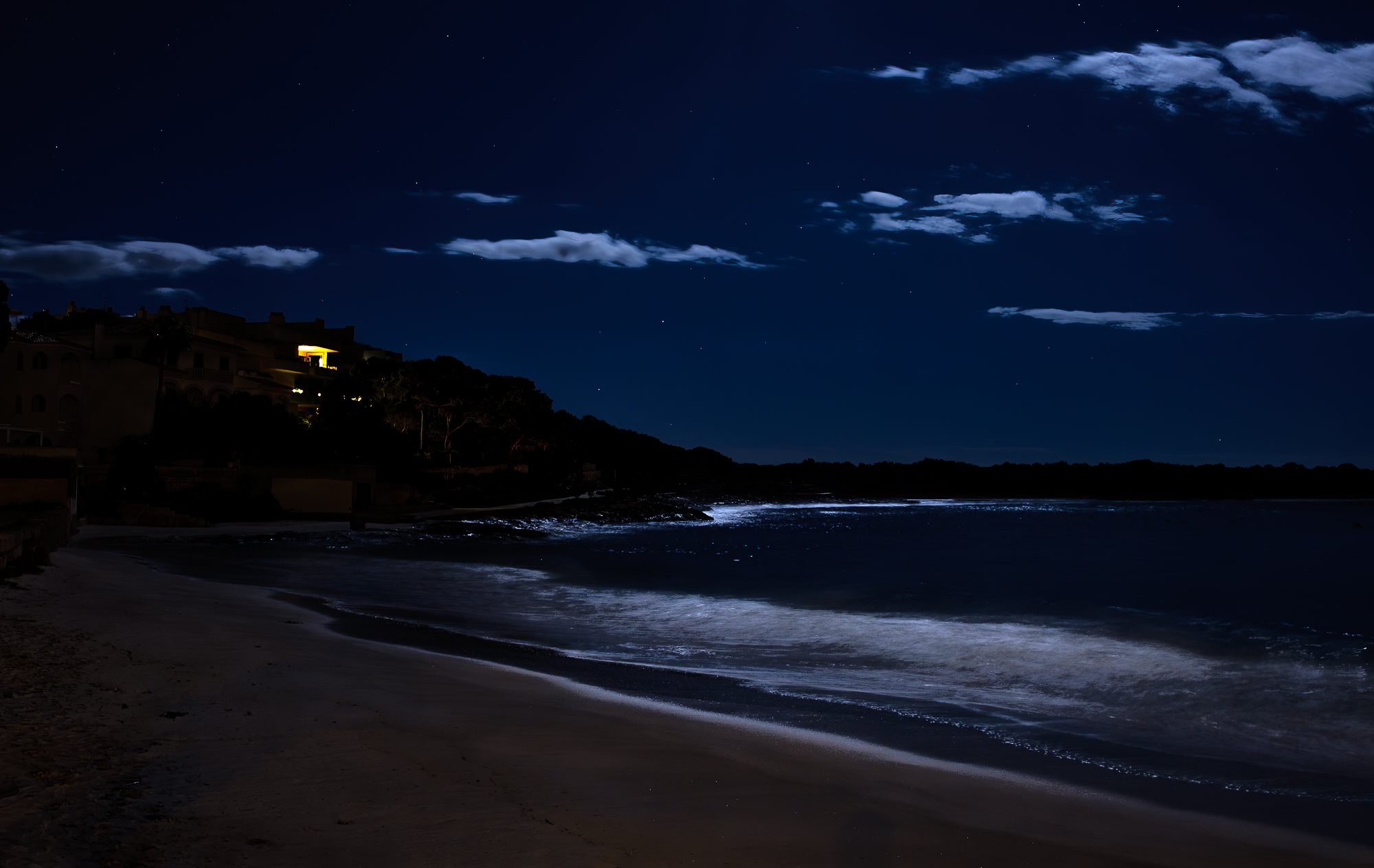 Creo que @Vicent tiene razón. Fue un reto para mí, que tampoco soy experto en fotos nocturnas (en realidad no lo soy en ningún tipo de fotografía), lograr sacar de una escena muy poco iluminada un buen reflejo de la luz de la luna en el agua, que fue el objetivo principal de la foto. Para equilibrar la imagen, procuré que en su parte izquierda hubiera cierto detalle y tonos más bien cálidos, a lo que contribuye la luz procedente de la casita iluminada. Quizá estos propósitos fueron demasiado ambiciosos para mí y no sé si, más o menos, los he logrado.