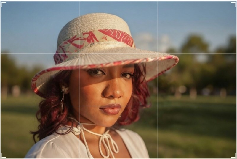 En tu toma, existen cuatro cortes, todos ellos en el sombrero, además de un corte inferior muy próximo a la barbilla. Lo que produce encajonamiento y espacios acotados o ventanas de luz que contribuyen a ese encajonamiento, por lo que no ayudan a armonizar el PPP ni suman valor a la intención, que no es otra que captar la belleza de esa mirada. La solución es lo expuesto arriba, menos cortes y más aire, que a mí modo de ver, permite dos opciones muy parecidas pero válidas desde el punto de vista meramente académico.