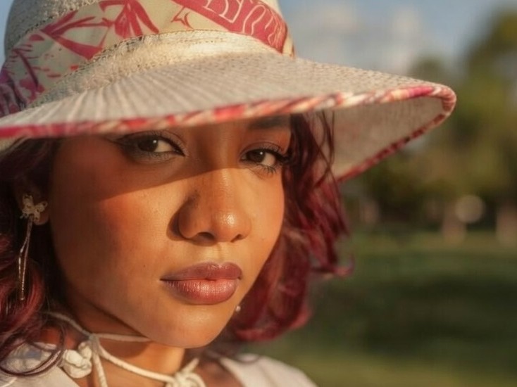 Partamos desde lo académico. En un retrato con sombrero, debe aparecer la modelo y complemento en su totalidad, con la modelo centrada, la mirada en el punto fuerte (regla de los tercios) y suficiente aire alrededor. Primer plano clásico.