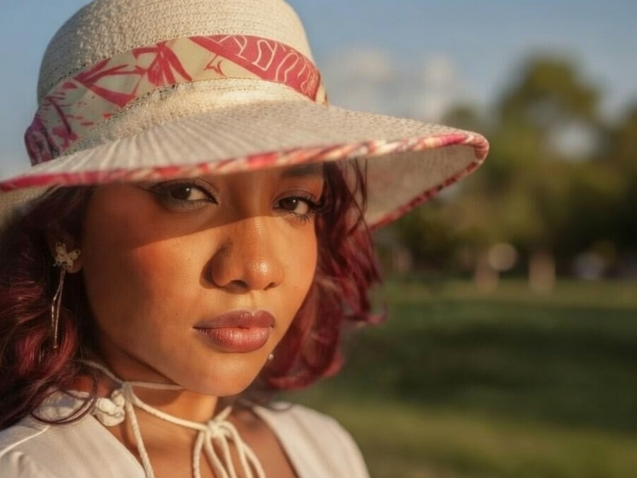El sombrero no solo es difícil de controlar en los primeros planos, precisamente por los cortes que producen y la sensación de encajonamiento que su brusquedad da. La solución, el aire por uno de los lados que comenta @Xoray. Por otro lado el sombrero y a la luz del sol no es buena idea, porque te produce unas sombras muy duras, fíjate en la nariz, y esa franja de sombra en los ojos. Parece que usaste una flash de relleno (por el puntito en los ojos) cosa que me parece una excelente idea. Otra vez, usa lo mismo, pero no lo hagas con el Sol en la modelo, y si lo haces, pon la modelo de espaldas al sol. Expón para el fondo y usa el flash para equilibrar la luz. Vigila las sombras que vas a proyectar. Tendrás una buena exposición y un resaltado por detrás.