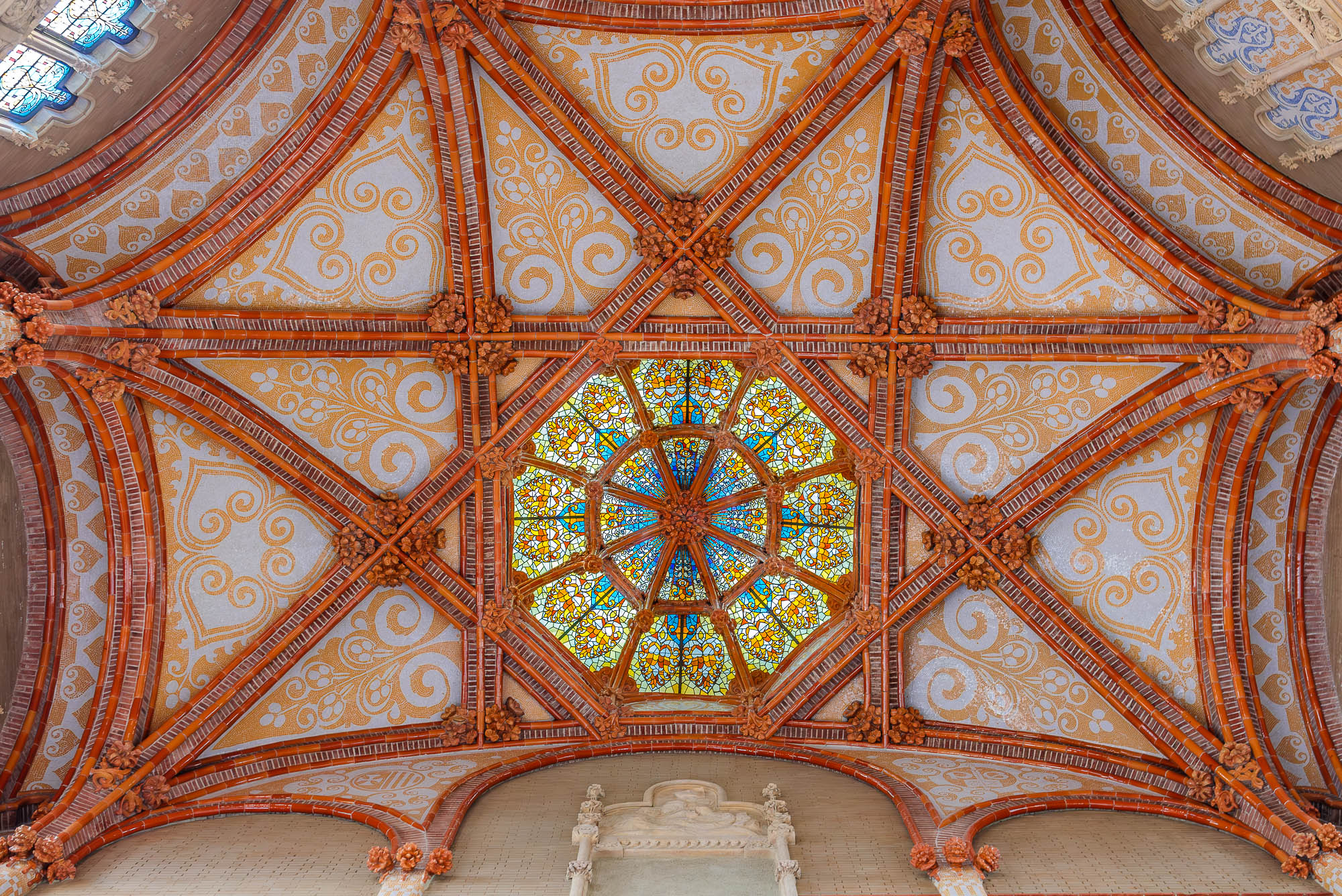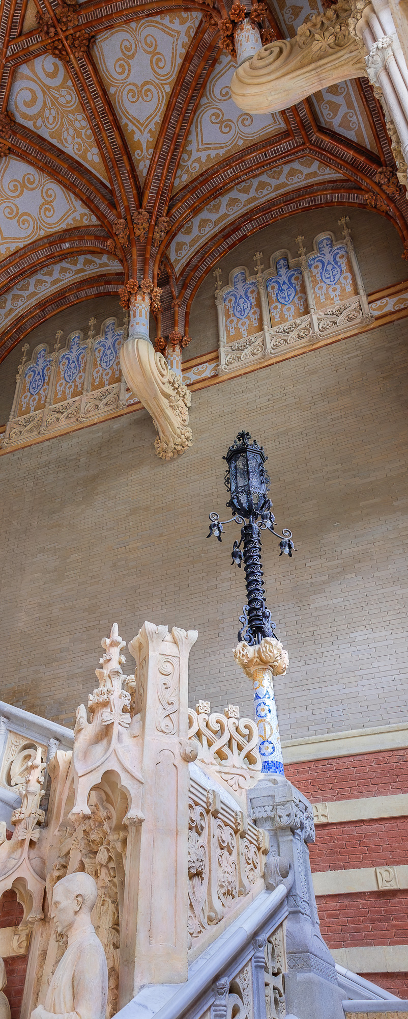 La foto corresponde al vestíbulo y la escalera del Pabellón de la Administración del Hospital de la Santa Creu y Sant Pau (Barcelona)