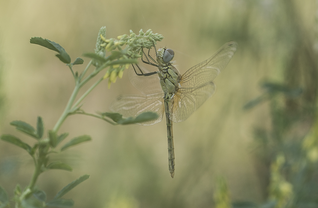 Si lo que querías, es que la libélula se viera medio camuflada con el entorno, te ha quedado genial, si por el contrario querías que destacara , ese tono no le viene bien.