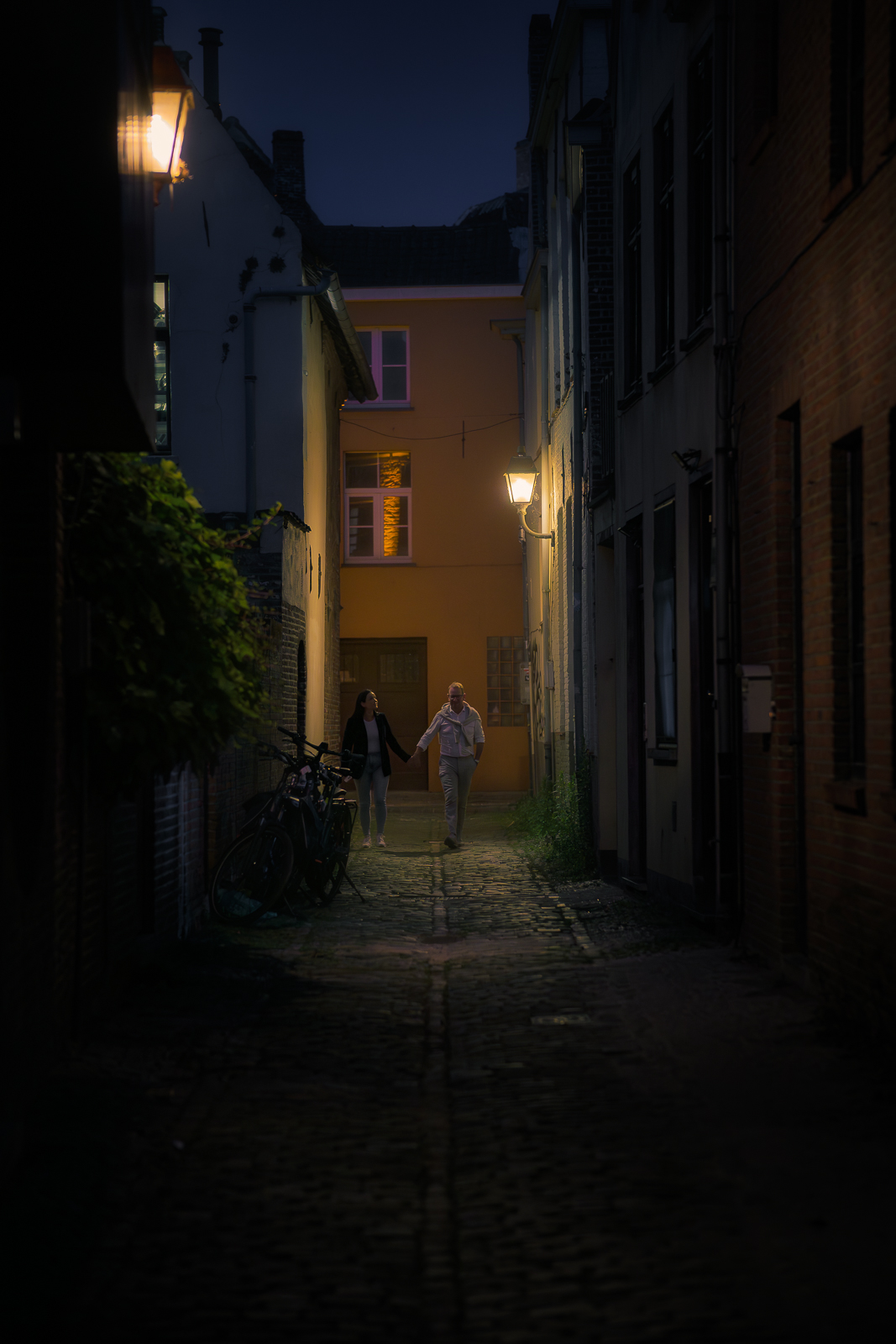 Bien pillada a la pareja Albert en marcada por las farolas, y la profundidad de la fotografía.